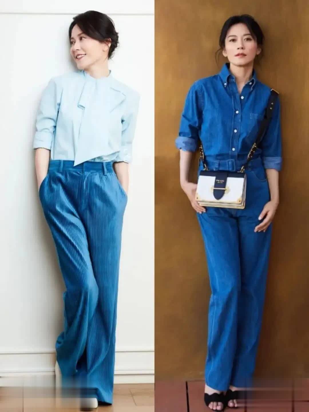 许多姐妹觉得年纪大了就得穿深色,其实适当运用亮色系反而能让人显得更年轻。浅蓝色上衣搭配深蓝色西装裤,不仅让整体造型更清爽,还能营造层次感。